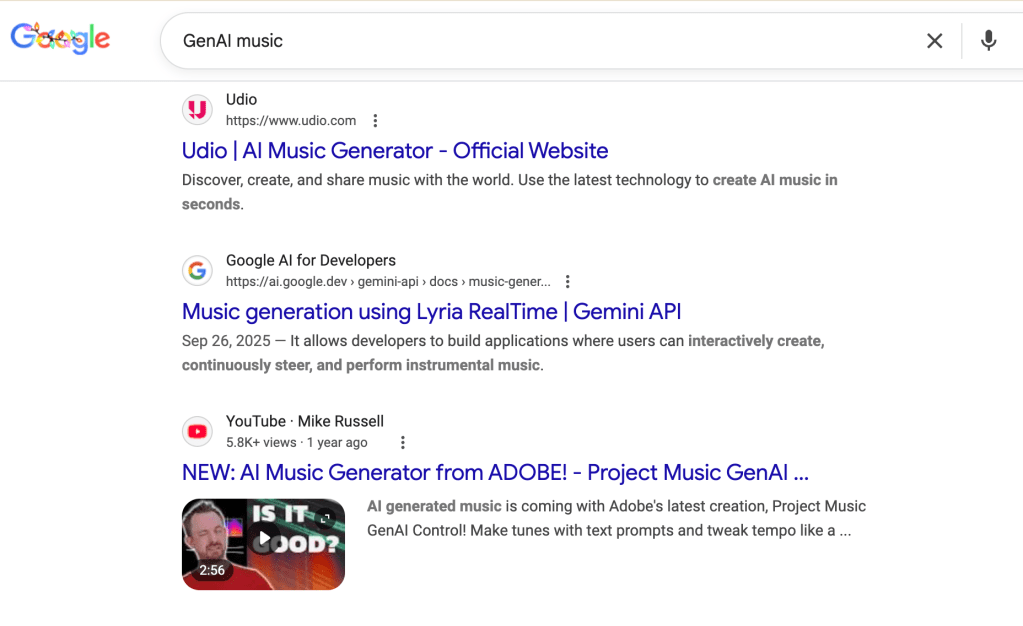 So I started to search “GenAI music” keyword. Turns out Adobe, Google’s Gemini, and a bunch of other platforms now let you generate music with a prompt.